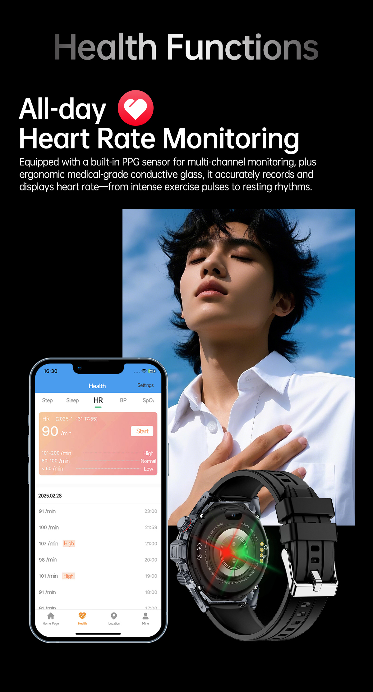 Equipped with a high-performance built-in PPG sensor and ergonomic medical-grade conductive glass, our smartwatch delivers multi-channel, accurate heart rate monitoring—whether you’re pushing through an intense workout or winding down at rest.